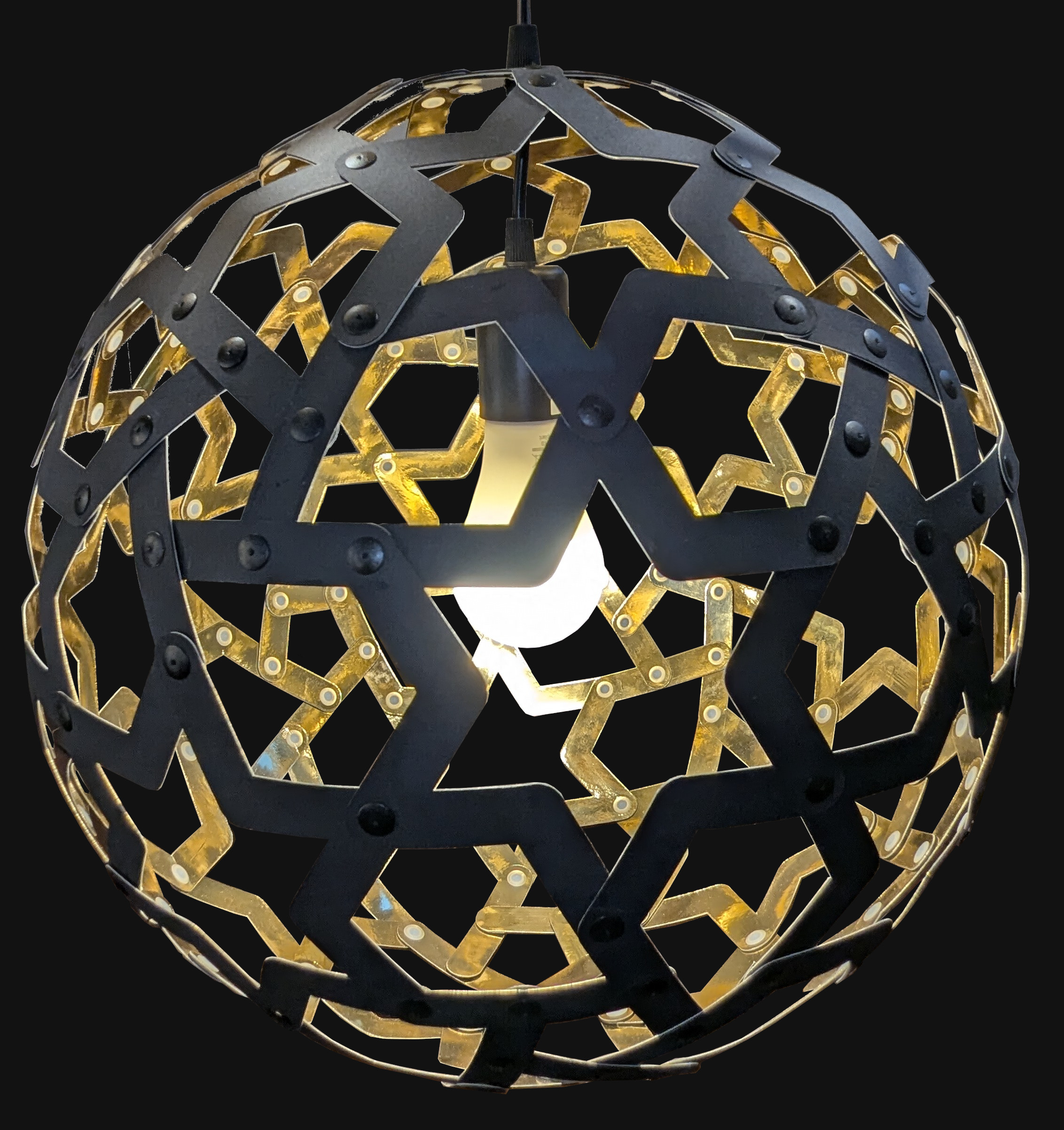 Assemblé à partir de 60 éléments identiques, il forme une sphère parfaite dont les entrelacements dessinent un motif en étoile, visible de jour comme de nuit.