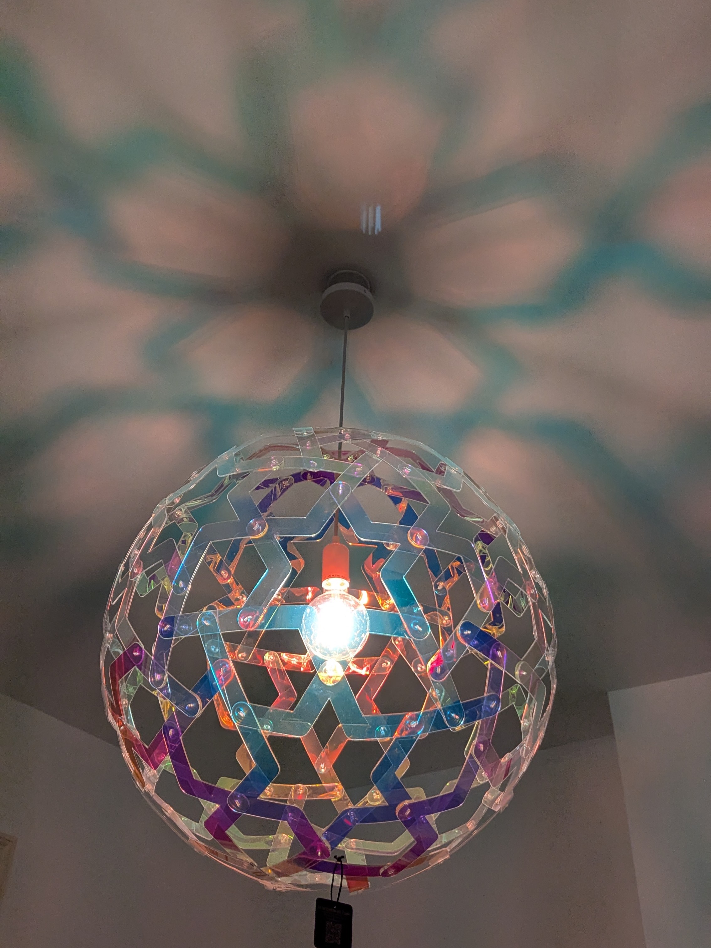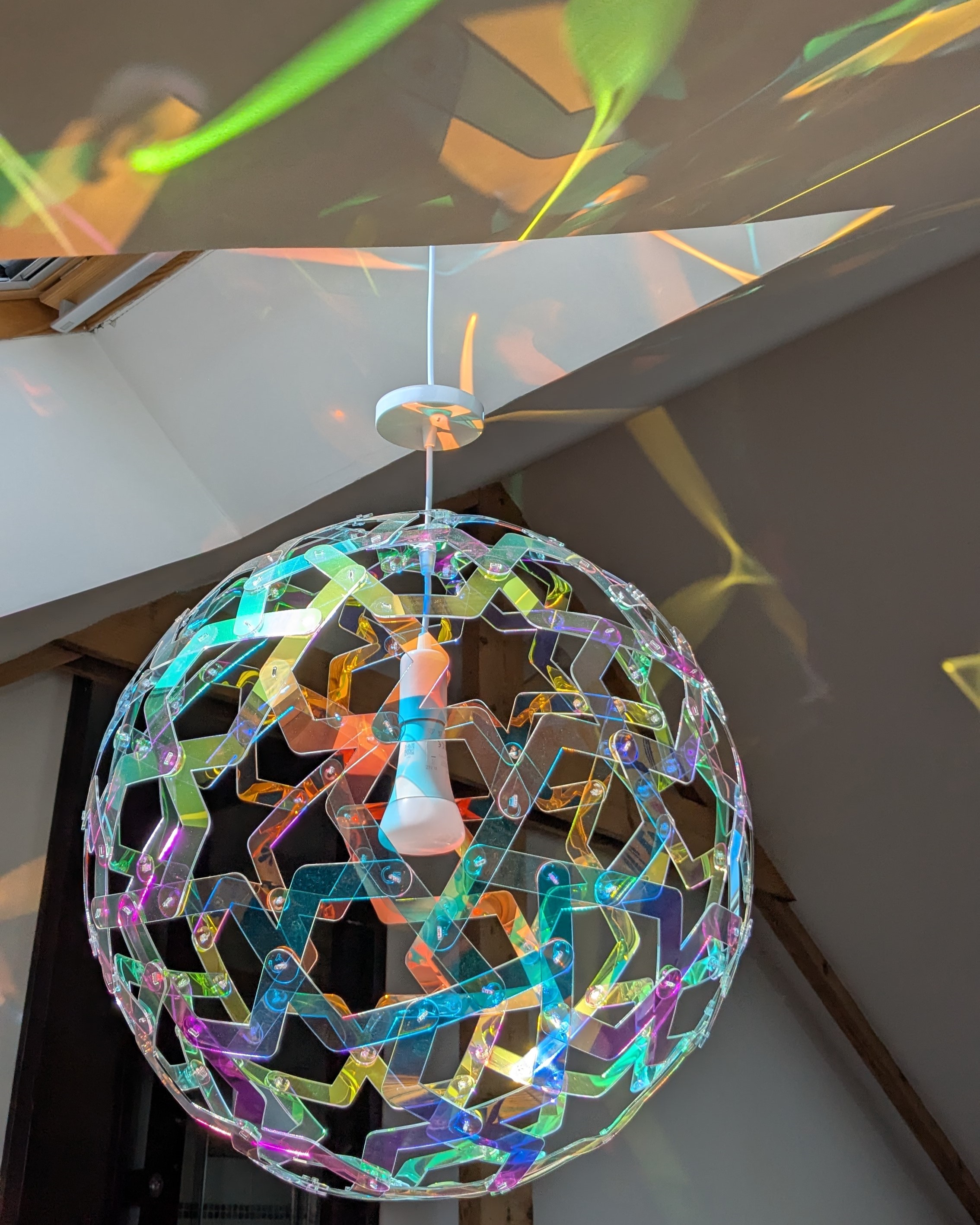 Éteint, c’est un objet de décoration sculptural. Éclairé, il projette un ciel étoilé au plafond. Et quand un rayon de soleil le frappe, ses reflets féériques flamboient dans tout votre intérieur.