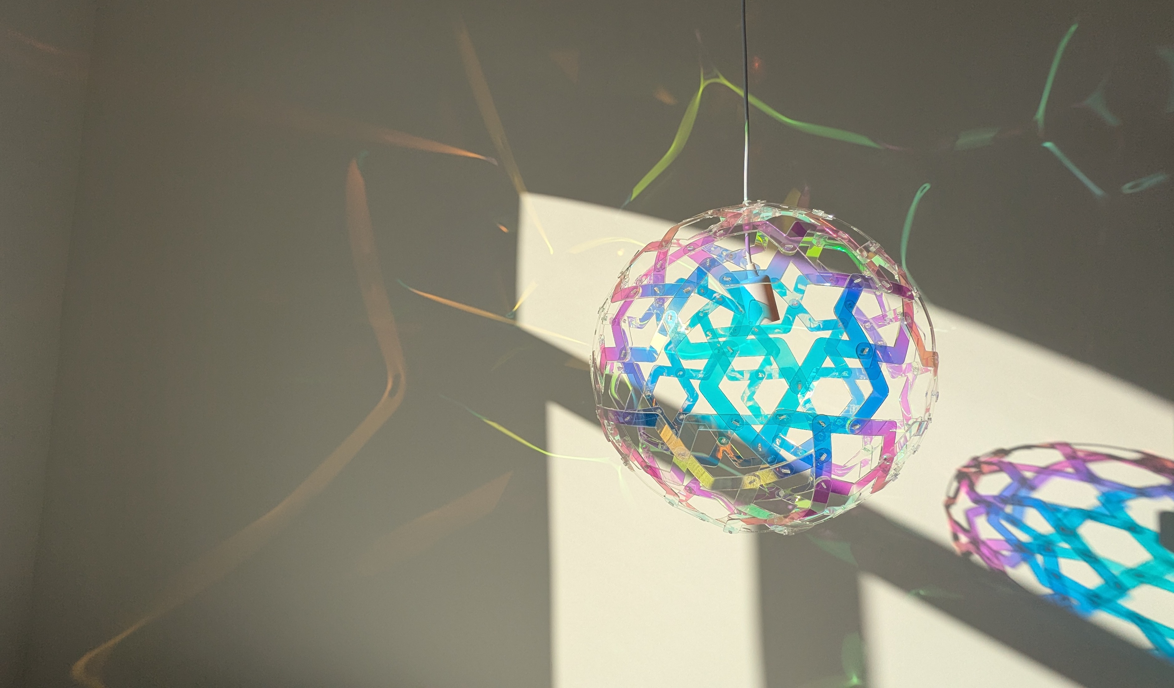 Assemblé à partir de 60 éléments identiques, il forme une sphère parfaite dont les entrelacements dessinent un motif en étoile, visible de jour comme de nuit.