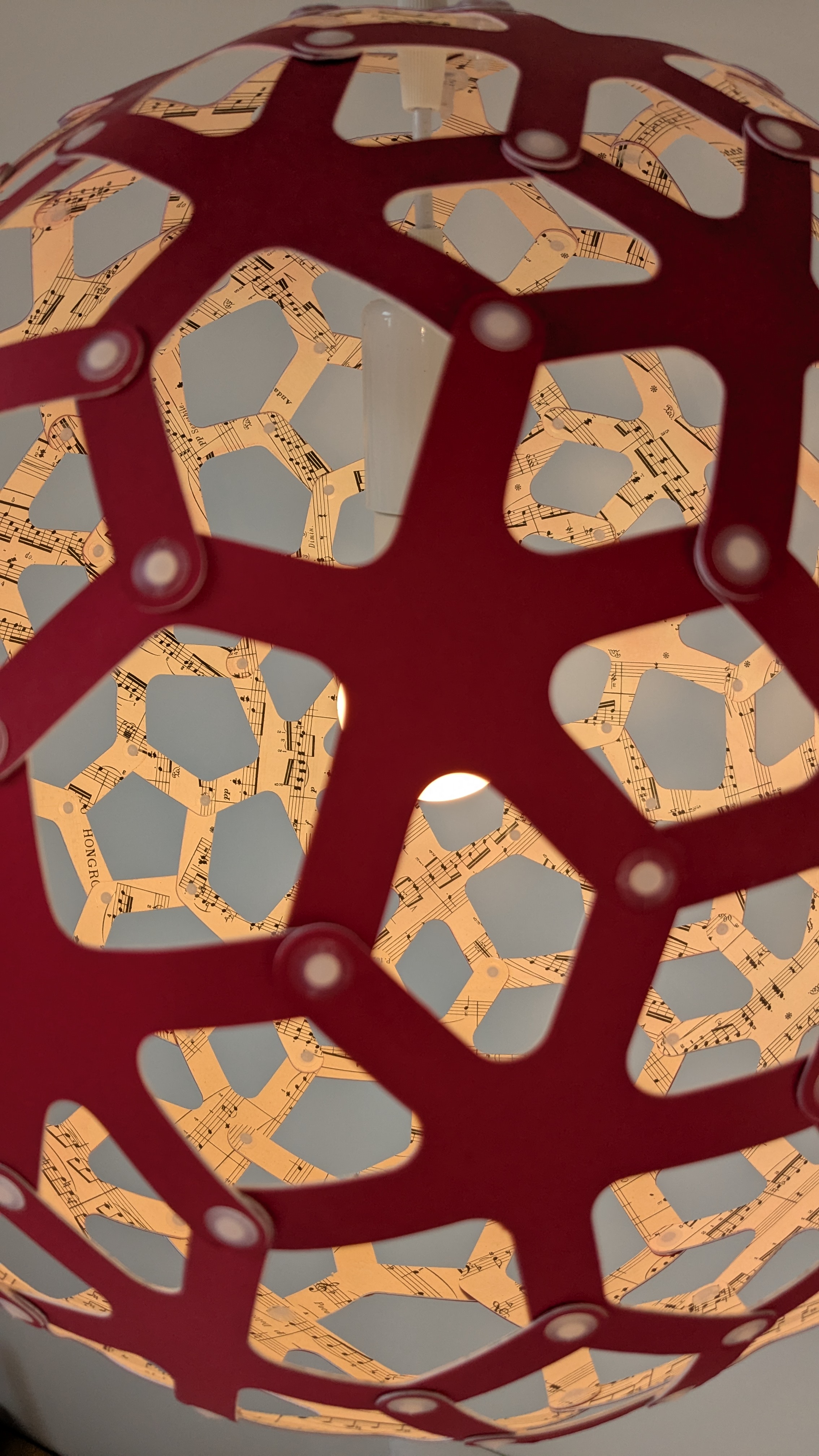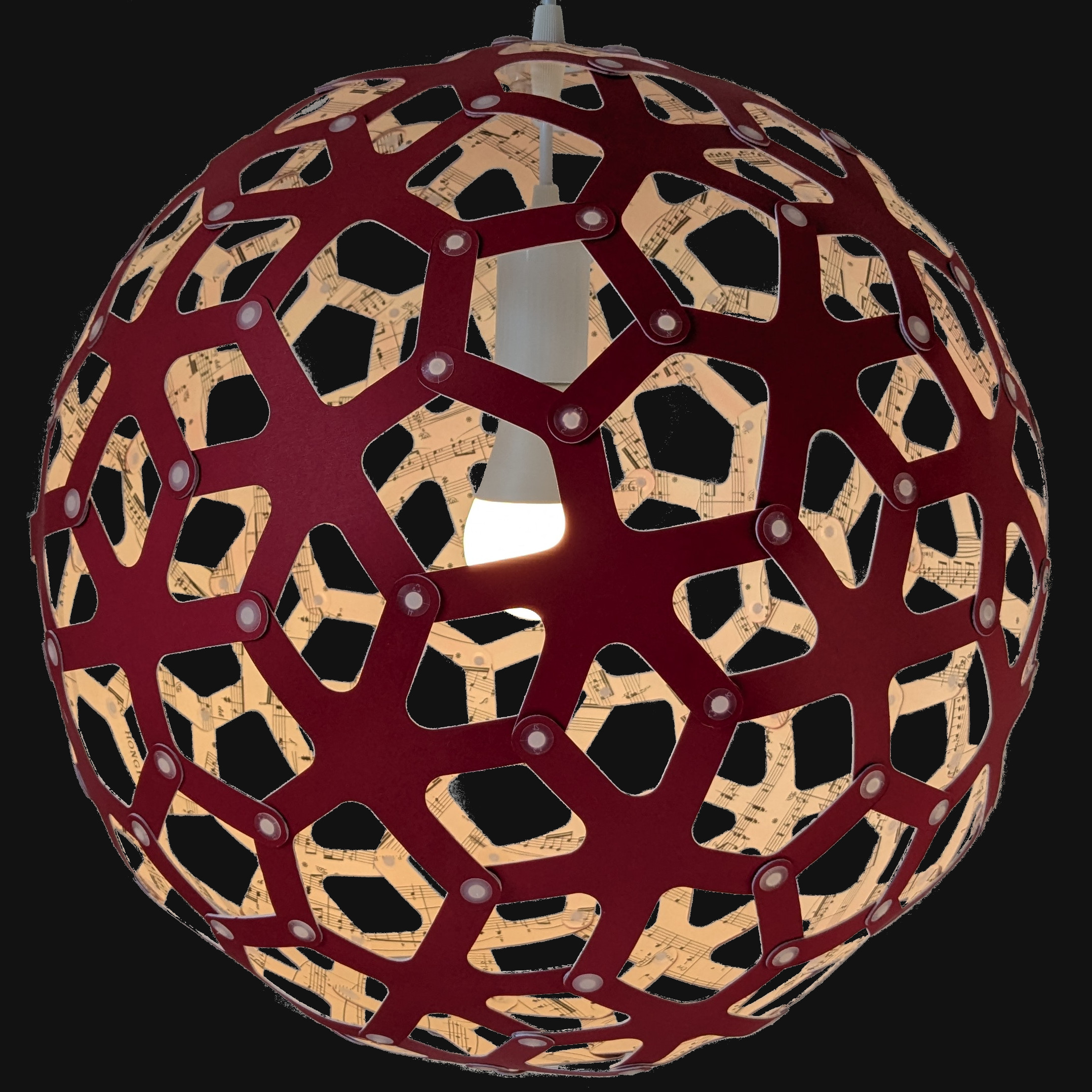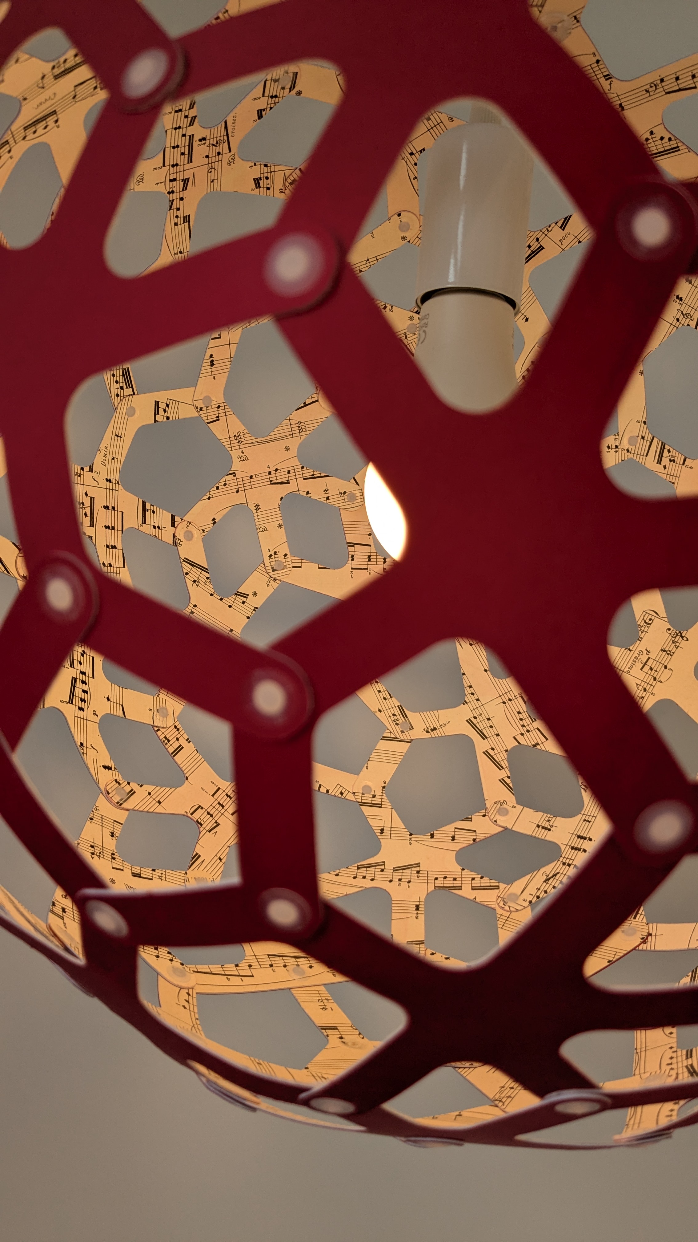 Le luminaire Lyra est une pièce unique en carton coloré, habillée de partitions anciennes soigneusement récupérées.